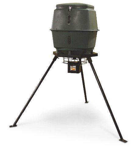 Have a need to spread some feed? Hunten Outdoors Digital Tripod Feeder does it on your timetable. SAVE BIG! Feed game on your schedule! Hunten Outdoors Feeder encourages deer to keep in the neighborhood by offering food during natural feed rhythms. Easy-program digital controls let you set the times feed is distributed in order to coordinate to your convenience. Built-low design makes it a lot easier to reach, too. No ladder required. Excess stock feeds you savings! Eat up: Simple assembly will have you up and running in minutes; Poly feed bin has a cube-like design to resist weather and damage; Black powder-coat frame shrugs off corrosion; Wide-throw legs support up to 40 gallons of feed; "Varmint Guard" keeps squirrels and other rodents from reaching the feed; Built-in feed window lets you monitor levels; Locking lid with spring-top joints seals out moisture; Tripod legs; Digital control unit has large LCD display with speed control, feed times and battery indicator (requires a 6V lantern battery, not included).; Measures 6'h., weighs approx. 35 lbs. Act Now! Please Note: Feeder does not include foot pads on the legs. Hunten Outdoors Digital Tripod Feeder